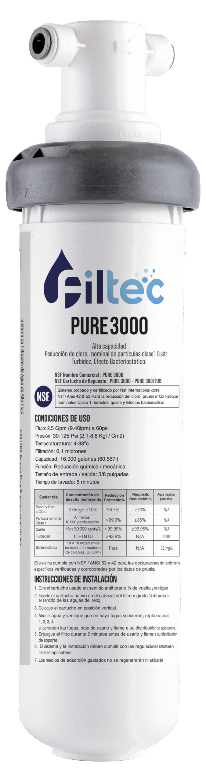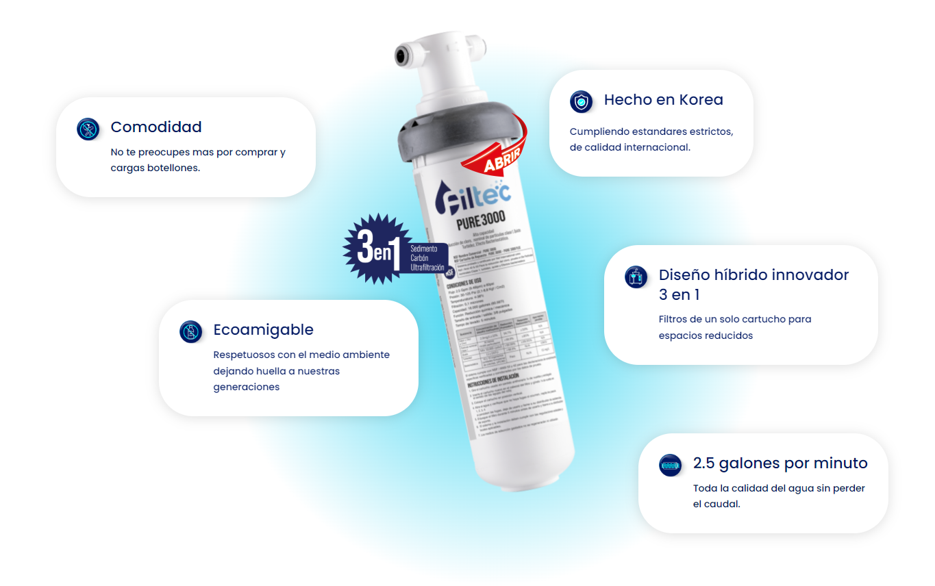 - Sistema de 3 etapas en un solo cartucho: Sedimento, carbón, ultrafiltración