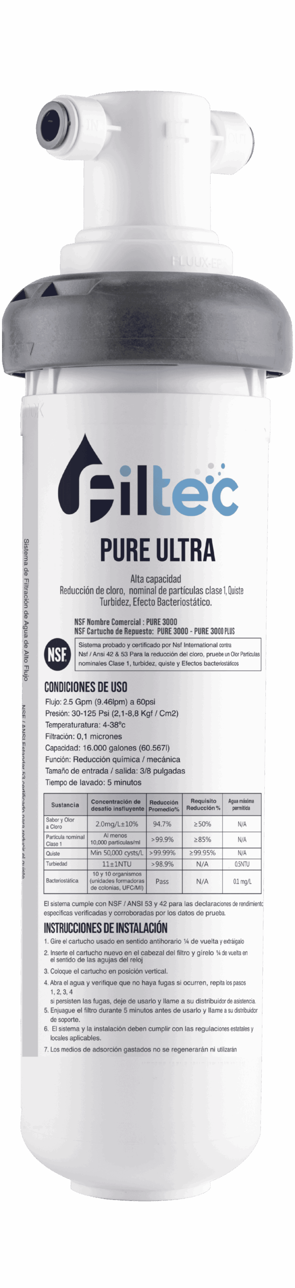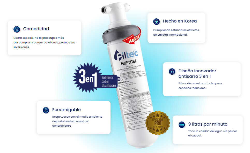 - Sistema de 3 etapas en 1 en un solo cartucho: Sedimento, carbón y ultrafiltración