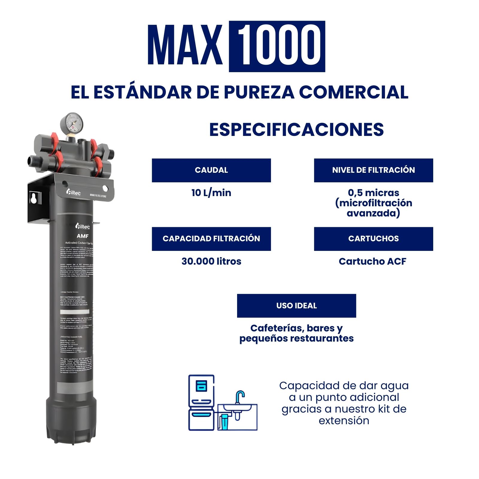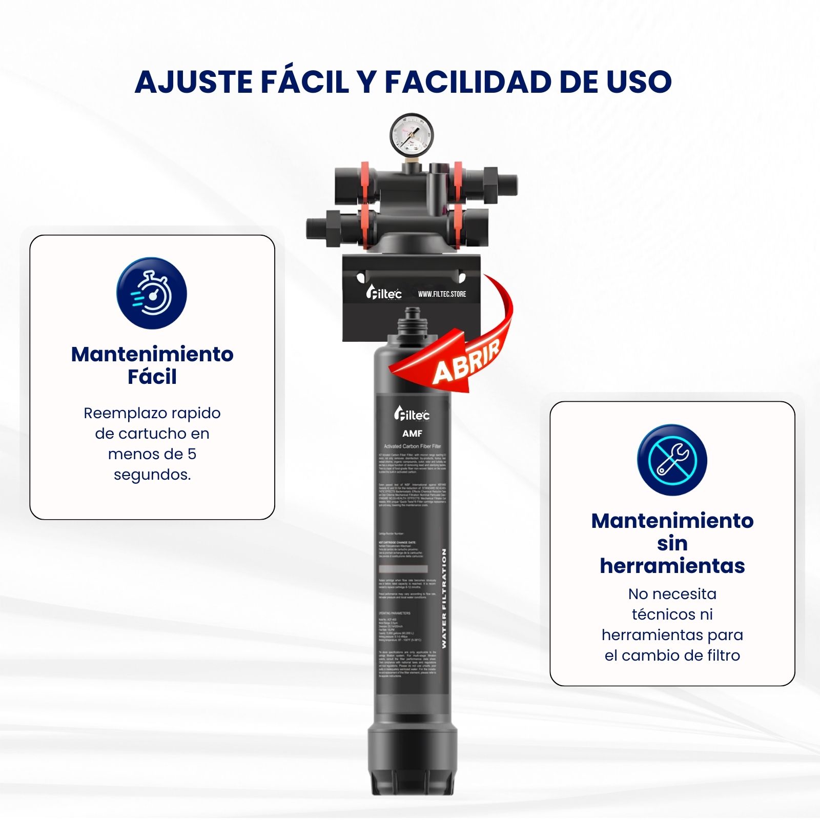 - Sistema de filtración avanzada de 3 etapas: sedimento, carbón activado (ACF) y microfiltración de 0,5 micras, ideal para mejorar la calidad del agua.