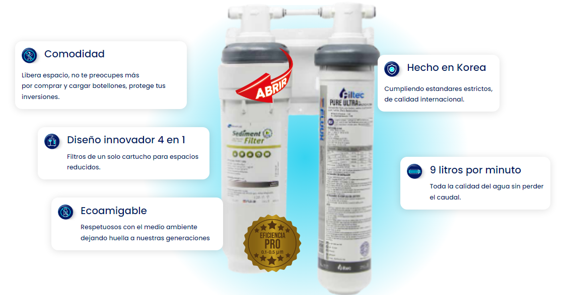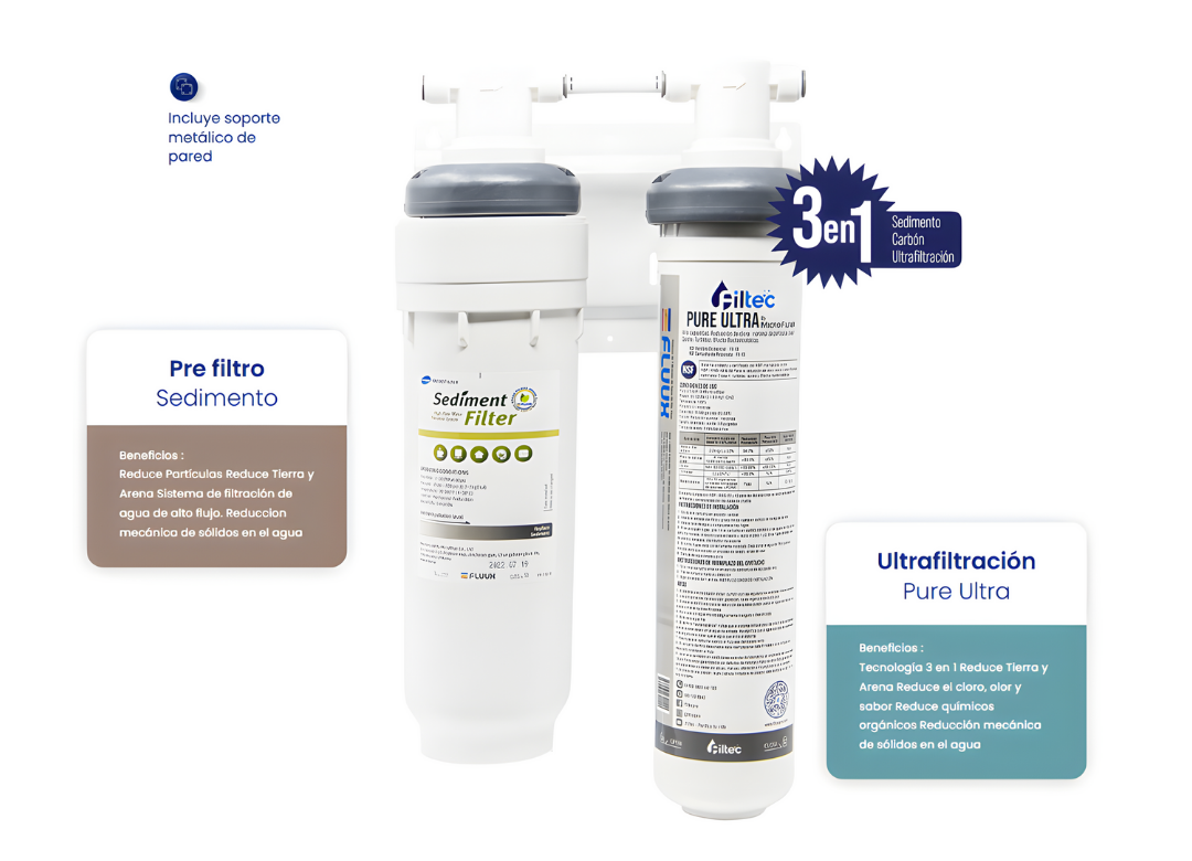• Sistema de 3 etapas en 1 en un solo cartucho: Sedimento, carbón y ultrafiltración.