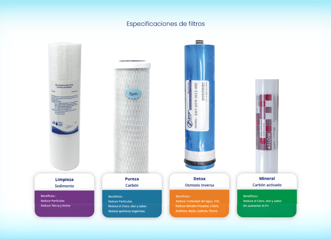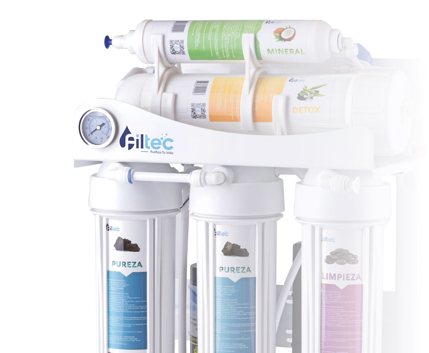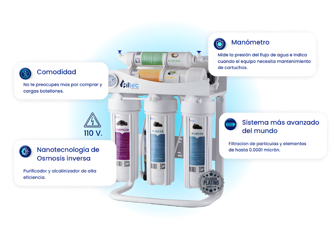 - Si necesitas seguridad para tus colaboradores o clientes, puedes contar con el sistema de ósmosis inversa para filtrar y purificar el agua. Cuenta con nanotecnología avanzada que purifica hasta 0.0001 micrón. Mejora el olor, textura y sabor del agua. Elimina partículas de suciedad, reduce químicos inorgánicos y sustancias iónicas.